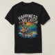 Denna svarta t-shirt har en glad tecknad som illustrerar en skäggig man som bär en fiskefatt och väst, som glatt rullar i en stor, färglös fisk. Ovanför illustrationen skrivs texten "HAPPINESS IS A" i ett böjt vitt teckensnitt, och nedanför visas "BIG CATCH" i ett större, böjt vitt teckensnitt. Bakgrunden visar en stiliserad solnedgång över en blå kropp av vatten. Den här designen antyder på att det ger lycka att fånga en stor fisk.