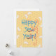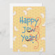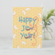 Ett punny Rosh Hashanah-kort som önskar ett lyckligt judiskt år med shofarar, bikakor och äppelskivor.