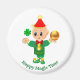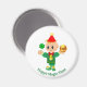 Vacker magnet med en söt tomte med tur, shamrock och guldkula. Den söta tomten i grön klänning håller en klöver för tur! Texten "Happy Magic Time" kan anpassas!