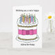 En gigantisk kaka med flerfärgade ljus ovanpå och en rosa bugar runt den. Orden "Önskar dig en mycket lycklig 102-årsdag" följer med bilden.