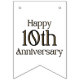 Denna girlang banner har orden "Lycklig 10-årsjubileum" i ett unikt tryckfont med svart kontur och guldbokstäver. Alla banderoller har ensidig utskrift utomhus säkra gjorda med robust plast polystyren och tjock plast rep har (16) 5,5" x 8" svanjungfana flaggor på en 6' lång snurra.