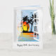 Den tropiska solnedgången i handflatan träd och segelbåten i ett öppet fönster för 45-årsjubileum. All text kan redigeras.
