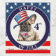En söt vin-etikett med en bulldog eller pug med amerikansk hatt för att fira 4 juli. Bakgrunden är USA flagga.