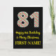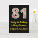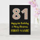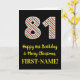 Den här roligtens framsida och det enkla jultemat och födelsedagstecknet december, 25:e födelsedag, har ett stort nummer "81" med en grönt/vit/röd rand mönster, tillsammans med meddelandet "Lycklig 81:a födelsedag & God jul" och ett eget namn. Bakgrunden till framsidan är svart färgad. Insidan innehåller ett anpassat hälsning-födelsedagsmeddelande eller kan kanske tas bort och lämnas tomt om ett meddelande ska skrivas för hand i stället. Ett sådant här födelsedagskort i anpassningsbar kan vara ett roligt för att skicka önskemål till någon som firar sin åttio första födelsedag och som också föddes den 25 december (juldagen). [~Z0000405]