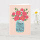 En Mason burk fyllde med en härlig massa peonier och vita blommor med handskriften ord 'För morsa' på märkrn och 'Lycklig 97:e födelsedagen' på Mason burk. Perfektens födelsedagskort för att fira din morsa födelsedag! © Ness Nordberg