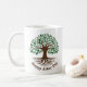 Utformning av Lycklig arbordagen. Träd med grönt löv, bruna trunkarter, bruna rötter och, som i färg motsvarar parollen: Lycklig arbordagen