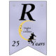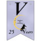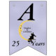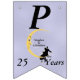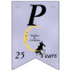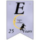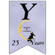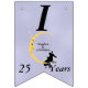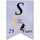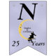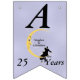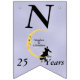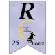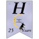 Den här flagga-formade banderollen Lycklig på årsdagen är ljusblå med ett kärleksfullt par sitta vid grund på en gult som ligger i måne och som tittar på dem med en arg ansikte. Vita tinkle-stjärnor ligger bakom måne. Anpassa namn, årsdagen och Lycklig-årsdagen med mallarna.
