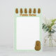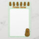 Kute brun potatis av tecknad med ett vidsträckt ansikte i lycklig i grundens hörn av högerna och ovanpå papprare är en linje av samma roliga potatis. Bakgrunden är en klassisk mönster av grönt och vita checkar, gingham. En mall som läser Potato Notes i orangen med text nedanför potatisraden längst upp på sidan är en mall som kan användas som den är eller som ändras till din egen namn eller text.