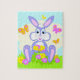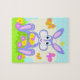 En kanin i lila lycklig med orange, rosa och gult och ljusa blommor, för barn och barn i hjärtat.