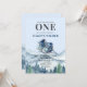 En rustik vattenfärgsgryning i lycklig, första födelsedag, med berg, skogar, små kamprskor, födelsedagsfest inbjudan. En perfekt inbjudan för en födelsedagsfest för camping med utomhusaktiviteter.