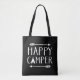 Anpassningsbar tryckte tote bags med trendig svart och vitt "Lycklig Camper"-typografiskt citat. Utformningen har en stampil gräns och en söt tonbild. Använda designen verktyg om du vill välja valfri bakgrund färg, lägga till egen text och foton för att skapa en unik design av ett slag.