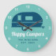 En trevlig väggklocka, perfekt för kameran eller RV. Visas med tealbakgrund och marin färgad med frasen"Lycklig Campers". Anpassa din familj namn för att göra den till ett slags. Du kan också ändra färg i bakgrunden så att den stämmer överens med dina dekor- och inställningar.