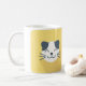 Ett klassiskt keramiskt mugg med en söt och enkel grafik av lycklig kattens ansikte. I designen visas ett vitt katthuvud med grått-prickar av mörk, en leende mun och whisky som ställs mot en mjuk gult. Det här mugg är perfekt för kaffe, te eller vilken hett som helst, vilket gör att du blir glad på din morgonrutin