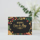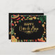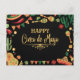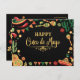 Detta vykort är en intressant inbjudan till Cinco de Mayo firande, designad med en festfläck. Riken, den svarta bakgrunden ställer in scenen, vilket ger en dramatisk kontrast som gör att varje inslag i designen bländar med häftighet. Det centrala hälsning, "LYCKLIG Cinco de Mayo", är elegant skrivet i ett strålande guld-typsnitt, vilket ger en lyxupplevelse av den traditionella festligheten. Kortets överkant och grund är lekfulla illustrationer som kapslar in helgdag anda. Dessa omfattar färgstarka sombreros med invecklad broderier, levande maracas, spiritad grönt cacti och fet röd chilipeppar, som var och en återges med en charmerande detaljeringsgrad. Bilderna är uppställda i en rad ljusa, dekorativa motiv, inklusive blommor och abstrakter, som ge är en nod på hantverksmässiga hantverk och naturskönhet som är synonymt med mexikansk kultur. En tjugonistrå papel picado, de mexikanska pappra dekorationerna, tillför ett vackert gräns längs grund och bidrar till det övergripande temat firande med dess rött, gult och grönt flaggor. Att slutföra utformningen är små ljusglimtar som tillför lite stollig, som om man imiterar gnistran av festive ljus. Med detta vykort blandas det klassiska inslagen av Cinco de Mayo med en modern designkänsla, och det skapar det som ett idealiskt biet för att skicka hälsning eller bjuda in vänner och familj till en Cinco de Mayo firande.
