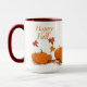 Stora orangar pumpar sitta i en säng av höst löv med vackra, flerfärgade, maple löv som faller, det här är en perfekt Lycklig Fall-scen.
