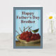 Det här kortet är att önska en Lycklig Fars dag till en favoritbror. Bilden på framsidan är en vintage bild av körsbär i en metallskål sitta på metall bord. Jag har återställt färg till en mycket realistisk tittar bild och ersatt den tidigare svarta bakgrunden med ett glansigt tittar blåstrimlat tapet. Du kan redigera den inre texten efter behov.