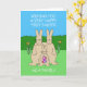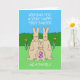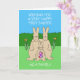 En tecknad av en kaninfamilj på tre, där baby-kaninen håller ett Påskägg. Ord " som önskar er ett mycket lycklig i första påsk som familj" följer med bilden.