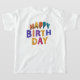 Den här färglösa T-shirt-designen innehåller meddelandet "Lycklig Birth Day" i ett lekfullt, missmatchat teckensnitt. Varje ord är ett annat ljust färg, med konetti sprinkles utspridda runt brev för en extra. Perfekt för födelsedagsfirande!