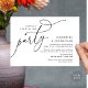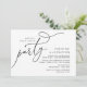 Meddela och dela upp ditt lyckliga slut i stil med vår moderna svart-vita temadesign (Lyckligt för alltid-fest) bröllopsflykt middag lunch brunch firande inbjudningskort. Det är idealiskt för par som har beslutat att fira sin bästa dag. Med sin sofistikerade men ändå lekfulla design kommer denna inbjudan säkert att sätta tonen för en ofögliglig händelse. Inbjudningskortet har ett modernt och minimalistiskt manusdesigntema som ger en touch av tidlös elegans till din fest. Designad av TeeshaDerrick