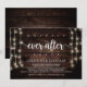 Vacker Lycklig För Evigt fest, Bröllop Elopement Annonsering / Inbjudningskort, i Rustik lantlig Trä, Strängljus design. Detta är perfekt för din bröllopsfest och efterbröllopsfirande. Lägg till dina detaljer i matchande typsnitt / bokstäver.