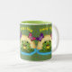 En groda och fjärilar från lycklig utgör denna roligt mugg. Anpassade så att du kan lägga till en egen text och ändra färg i bakgrunden. Gör en underbar gåva!