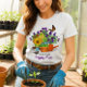 Om du njuter så kommer du att kärlek den här T-tröjan. Den här vita t-tröjan gör att station pottas med lila Viola-blommor, vattenburk och andra trädgårdsbehov. Jag lade till en övertäckning av en fågel och en fjäril och känner att de gör denna perfekt. Köp den här sommarens vita garanti för dig själv eller som gåva till en annan trädgårdsmästare.