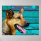 Lycklig Smiling German Shepherd hund mot en rustik teal bakgrund