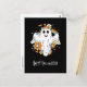 Ett vykort med en illustration av ett leende spöke. Dekorerad med blommor, regnbågar och fladdermus.