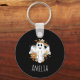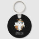 Nyckelkedja med en illustration av ett leende spöke. Dekorerad med blommor, regnbågar och fladdermus.