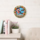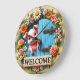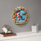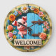Den här cirkulära väggklockan visar en charmerande scen med ett leende rosa gris som pissar ut bakom ett blått grind. Grind är omgivet av ett dynamiskt spektrum av färgstarka blommor, inklusive daisy, ro och blåklockor, som bildar en vacker blommigt andedräkt. Ett "WELCOME"-tecken hänger under gris. Klockan är innesluten i en gyllene, ribbad ram.