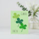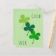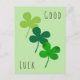 Lycklig Grön Shamrock Klöver Postkort. Tre shamrocks i olika gröna nyanser. Du kan ändra texten Lycka till om du vill. Klöver med fyra blad för tur. Bakgrunden är grön.