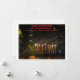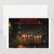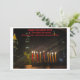 Bilden visar ett Hanukkah-kort med ett cityscape i natt med en ljusbelyst menorah i förgrunden. Mejoran har nio ljus, alla tända, som symboliserar Hanukkahs åtta nätter. Kortet innehåller meddelandet "Lycklig, Healthy Hanukah 2024" och du kan anpassa texten!