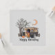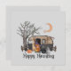 Denna utformning innehåller frasen "Lycklig Haunting" med en kamper-/släpvagn, en spooky häxa på en kyrkogård. Det är perfekt för ävententurous, camping-älskare, jakt-älskare i Halloween eller höst-/fallsäsong.