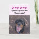 Budskapet på det här roliga Påsk-kortet säger: "Åh pojke! Jösses! Var gömde du Påskäggen?" Tillsammans med att önska dig en "Glad påsk" finns det små tass avtryck, "sniffen" och "flisor" som Heidi söker och hittar tre gömt Påskägg på insidan av detta kort. Det här Påsk-kortet innehåller vår vackra Rottweiler-valp, Heidi, eftersom hon sitter glatt med sin mun öppen i ett stort, toedig leende. En perfekt med Påsk-kort för alla.