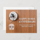 Söt lycklig hemårsdag uppföljningskort för en fastighetsmäklare att skicka ut till tidigare kunder. Lånekontor och bolåneföretag kan också använda dessa kort som ett modernt marknadsföringsverktyg för att påminna tidigare kunder som kan vara redo att refinansiera eller leta efter ett nytt hus. Detta fotografi visar en nyckel i en dörr med en dinglande nyckelring i form av ett hus.