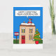 En söt tecknad av ett hus med ett festligt träd utanför och ett sålt skylt. Jultomten är tittar över tak i huset och säger "Lycklig jul från er sal".