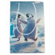 Två penguiner dansar gärna framför en igloo under en solig himmel. Text kan ändras.