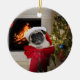 Pug Misha är redo för helgdagarna med hans båge och julhatt framför eldstaden och Julgran