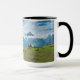 Fotot visar kor i lycklig på gården i fält i skugga av snöberg i Schweiz.