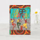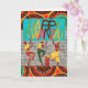 pappert hälsningskort för lycklig Kwanzaa med en illustration av att dansa människor med en trumma och färglöst mönster. En skarp och färgstark illustration med afrikanskt inspirerat mönster och glatt budskap. Lägg till ditt eget meddelande inuti om du vill. Art, bild och versell copyright © Shoaff Ballanger Studios, 2022.
