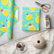 Papper med en mönster av leende citroner som bär tomathattar på en ljus tealbakgrund.