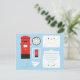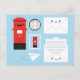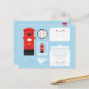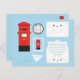 Postlådan Kawaii mellan Storbritannien och stil, brev, frimärke, kuvert och pappra flygplan mot blå bakgrund.