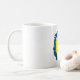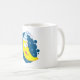 En blå och vit hatt i lycklig gult måne ansikte. Den här designen ser ut att gälla i Mugg
