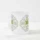 Älskvärd lycklig mugg med eleganta designer för rundagallerarbete från löv. Ett grönt fyrklövert sitter i mittet av varje cirkulärdesign. En vilken härliga mugg att dricka ditt irländska kaffe från och gör utmärkta gåvor för Sts Patrick dag.
