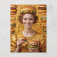 En kvinna håller ostburgare som är klädda i ostburgare, matad kostym och som står framför en del ostburgare, temat tapet