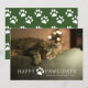 Det här julkortet för kattälskare har frasen "glada pawlidays" i vitt med ett litet tassavtryck mitt emellan de två orden. Baksidan har ett grönt och vitt tassavtrycksmönster.