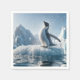 En penguinshakes från vatten när han stod på en flytande isflod omgiven av stora isberger under ett klart himmel.