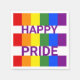 Kasta ett HBT-Pride party med 3 regnbåge med flagga ord LYCKLIG i fet lila typografi mellan dem på vit bakgrund. Röd, orange, gult, grönt, blått och violett färg går från lämnat till höger. Om du vill visa den moderna färgstarka gay pride-designen på andra objekt klickar du på samlingen "Rocklawn Arts".