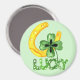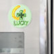 Festlig vattenfärgskollage som är bra för St. Patricks dag eller när som helst du vill fira irländarnas tur! Designen har grön shamrock / fyrklöver med guldfärgad hästsko och ordet LUCKY i grönt och vita prickar.