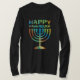 Fira Hanukkah med denna långa muff skjorta för den färgrika helgdag för damer, som läser, "lyckliga Hanukkah" över en menora.